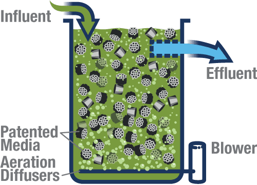 Flow enters the fully-aerated tank and encounters the biofilm-coated media. Coarse effluent screens prevent the patented BioPorts media from leaving the tank. Depending on the configuration, multiple tanks in series can be used to meet low effluent requirements and/or address several different contaminants and nutrients.