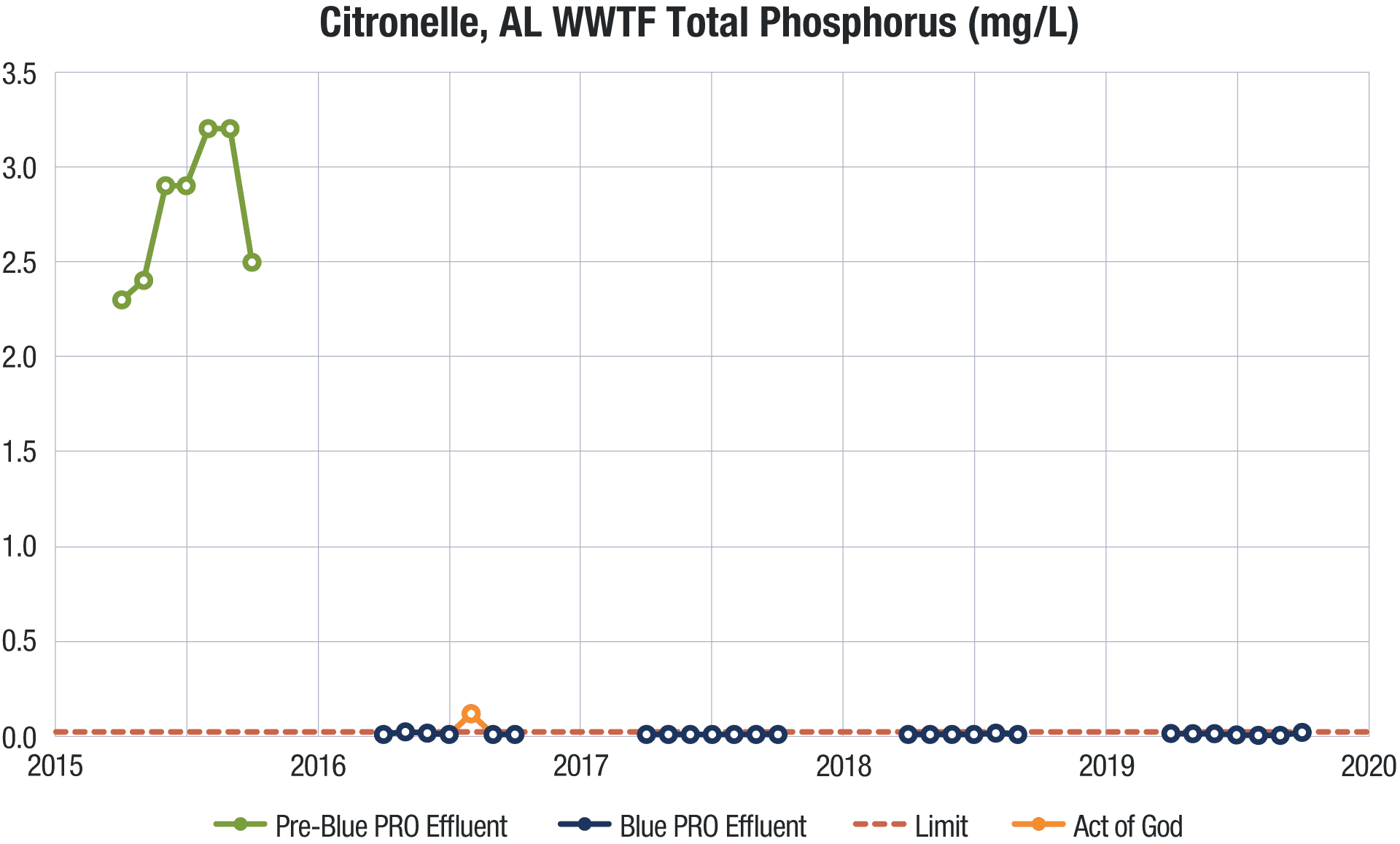A 0.1 mg/L limit has historically been considered an ultra-low target. But in Citronelle, they faced an even steeper challenge from regulators with a new ultra-low phosphorus target of <0.02 mg/L, which is among the lowest requirements in North America.
