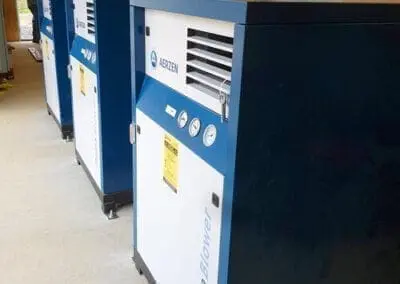 In addition, to overcome the electrical limitations, Nexom supplied Leeds with blowers equipped with variable frequency drives (VFDs). The VFDs were installed to convert single phase power to 3 phase power so an efficient blower system could be used for aeration. Also the VFDs allow for the changing flow over time and the wide range of treatment conditions that occur between the winter and summer temperatures.