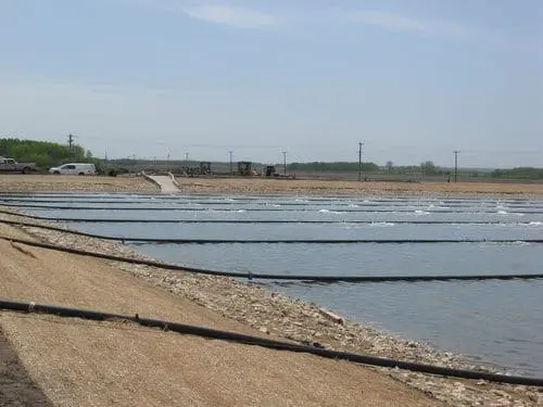 In aerated cells, diffuser density is based upon oxygen demand. The system installed at LPFN consists of fine-bubble aeration distributed through diffusers suspended near the bottom of the pond to maximize oxygen transfer efficiency. The diffuser design prevents bubbles from combining, resulting in excellent oxygen transfer rate.