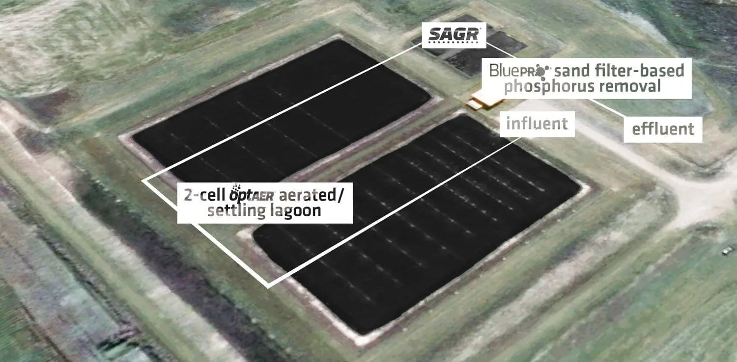 Aeration provides oxygen, residence and contact time for the natural bacteria, which ultimately convert the wastewater contaminates (BOD, ammonia, and TSS) to carbon dioxide, water, inert ash and nitrates. It also provides effective odour control. The optAER system does not rely on algae or natural surface aeration for providing oxygen to the wastewater.
