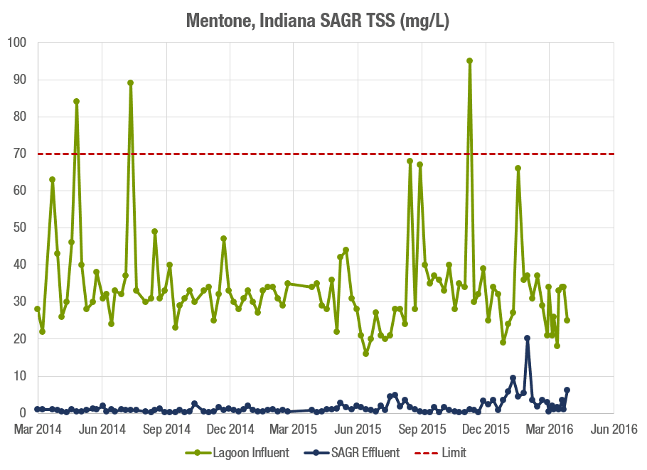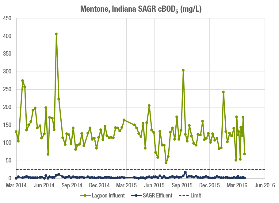 The upgrade of the facility utilizing the SAGR process enabled the Town of Mentone to not only meet but surpass current NPDES requirements. Utilizing the facultative lagoons for secondary treatment by the SAGR process for nitrification and BOD/TSS polishing will lead to an estimated 50% operation and maintenance savings compared to a fully mechanical aerated treatment system.