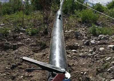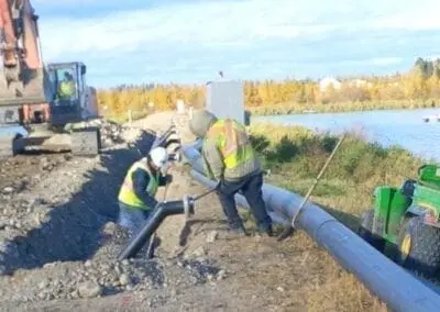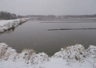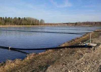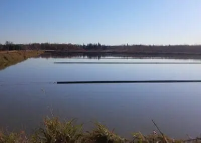 The construction design for the site was not only to upgrade the existing lagoons, but also not damage the areas around them. An Environmental Construction Operation Plan (ECO) was developed to prevent and/or minimize the environmental impact of the project. Most of the work undertaken on site occurred in or on the wastewater, within the existing lagoon cells. While performing in-water work, care was taken to minimize bank erosion. Any excavation and backfilling work required was performed in such a way as to minimize disturbance to existing vegetation and to minimize erosion due to runoff, as well as to not compromise the integrity of the berm or lagoon liner. An area nearby was designated for material storage, as well as the staging of personnel and equipment in order to minimize surface disturbance.