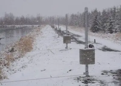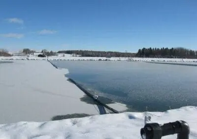 The goal for this project was to maximize the use of the existing lagoon infrastructure and provide a process that was reliable, simple and cost effective to operate. The process also needed to provide consistent performance in winter water temperatures (November through April) that can be less than 1°C. The optAER system was designed to meet 10-year hydraulic and loading requirements (combined flows at 3333 3/day) and consisted of several upgrades, including the optAER aeration system with floating laterals for enhanced BOD and TSS removal. Three positive displacement blowers were installed to provide air supply for the optAER treatment system, to provide both the required airflow during normal system operation and the capability to operate at maximum pressure for diffuser purging. The additional benefits of using positive displacement blowers at Rocky Mountain House included consistent flow of air to the pond regardless of discharge pressure, as well as simple operation and maintenance. All three blowers were provided with all-weather sound-reducing enclosures for placement on an outdoor concrete pad. Aerating the existing lagoons would serve two key purposes – odour control and oxygen distribution for bacteria growth. Additionally, by utilizing the existing lagoons, Rocky Mountain House was able to realize cost savings both in the construction, and in the long-term operation and maintenance of the system. Despite the existing location of the lagoons inside town limits, odour control wasn’t a primary concern, but by aerating the existing system now, Rocky Mountain House could avoid this becoming an issue in the future as the town grew.