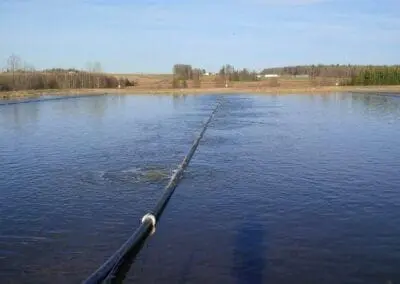 With aerated cells, the diffuser density is based upon oxygen demand. The system installed at Rocky Mountain House consists of fine-bubble aeration distributed through diffusers suspended near the bottom of the pond to maximize oxygen transfer efficiency. The design of the diffusers prevents bubbles from amalgamating, resulting in excellent oxygen transfer rate and minimal head loss.